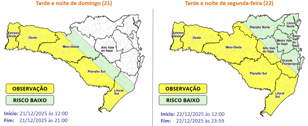 Neste domingo (21) e na segunda-feira (22), a circulação dos ventos em diversos níveis da atmosfera combinada com o calor e umidade, favorecem o desenvolvimento de temporais isolados com chuva pontualmente intensa em Santa Catarina, especialmente nas áreas que fazem divisa com o Rio Grande do Sul. O risco é baixo a moderado para ocorrências associadas a alagamentos, danos na rede elétrica, queda de galhos e árvores e destelhamentos.