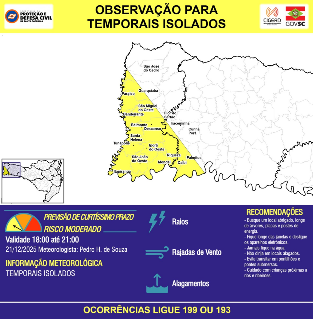 OBSERVAÇÃO – 21/12 18:00 – TEMPORAIS ISOLADOS com RAIOS, RAJADAS DE VENTO e ALAGAMENTOS pontuais para as regiões do Extremo Oeste e Oeste nas próximas 3 horas. Ocorrências ligue 199 ou 193.