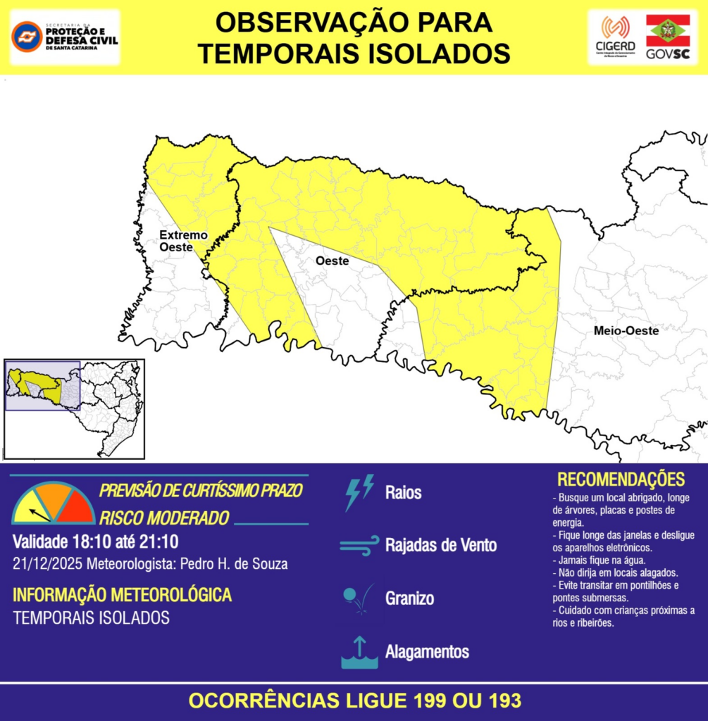 OBSERVAÇÃO – 21/12 18:10 – TEMPORAIS ISOLADOS com RAIOS, RAJADAS DE VENTO, GRANIZO e ALAGAMENTOS pontuais para as regiões do Extremo Oeste, Oeste e Meio-Oeste nas próximas 3 horas. Ocorrências ligue 199 ou 193.