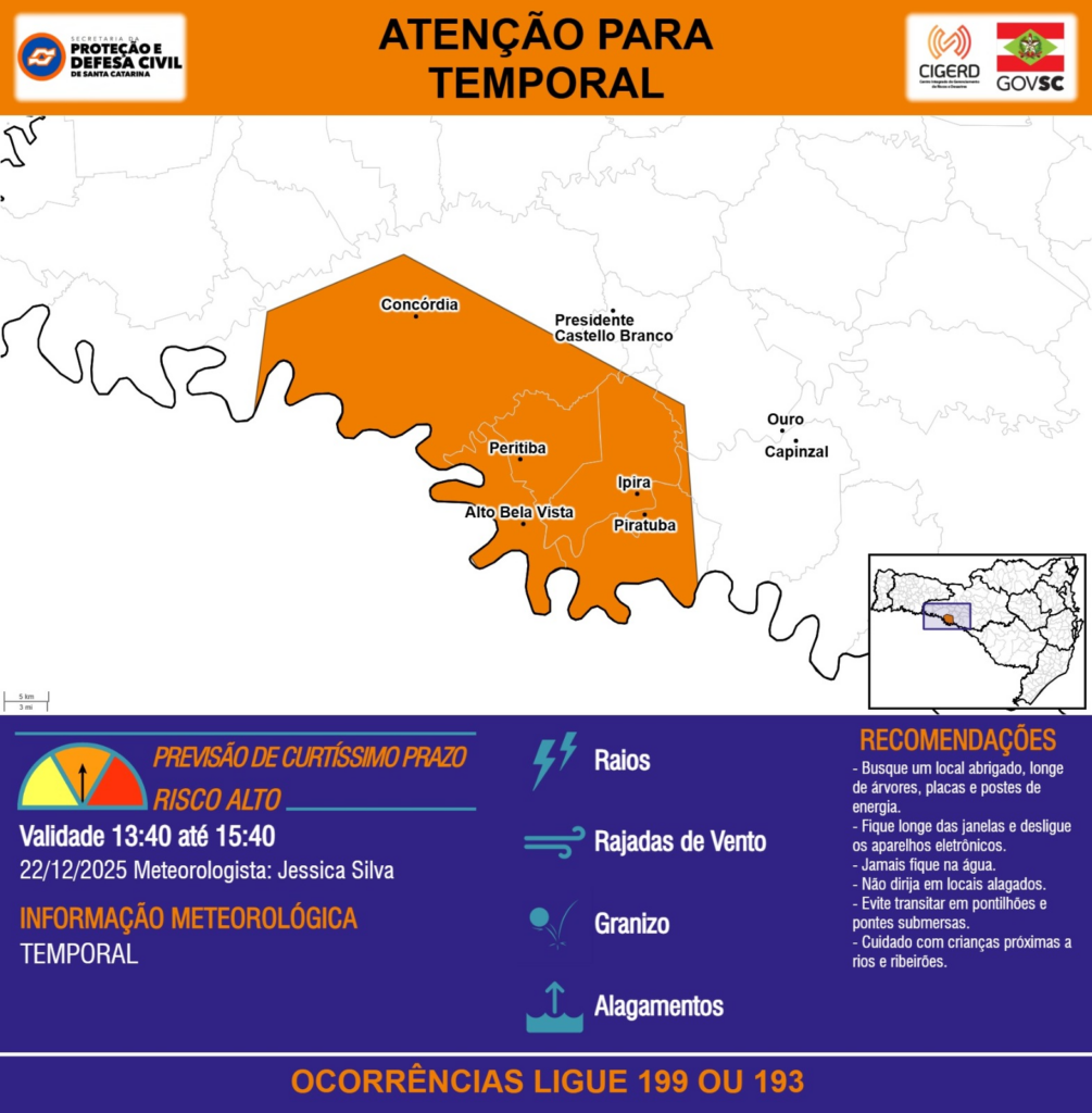ATENÇÃO – 22/12 13:40 – TEMPORAL com RAIOS, RAJADAS DE VENTO, GRANIZO e ALAGAMENTOS para os municípios de Alto Bela Vista, Capinzal, Concórdia, Ipira, Ouro, Peritiba, Piratuba e Presidente Castello Branco nas próximas 2 horas. Ocorrências ligue 199 ou 193.