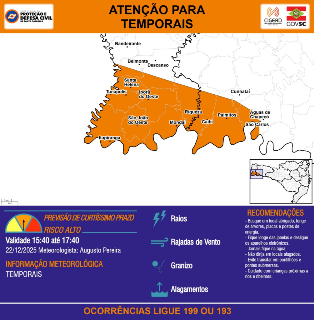 ATENÇÃO – 22/12 15:40 – TEMPORAIS com RAIOS, RAJADAS DE VENTO e GRANIZO para os municípios de Bandeirante, Belmonte, Caibi, Cunhataí, Descanso, Iporã do Oeste, Itapiranga, Mondaí, Palmitos, Riqueza, Santa Helena, São Carlos, São João do Oeste, Tunápolis e Águas de Chapecó nas próximas 2 horas. Ocorrências ligue 199 ou 193.