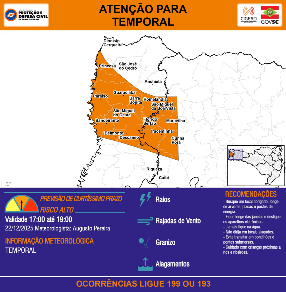 ATENÇÃO – 22/12 17:00 – TEMPORAL com RAIOS, RAJADAS DE VENTO, GRANIZO e ALAGAMENTOS para os municípios de Anchieta, Bandeirante, Barra Bonita, Belmonte, Caibi, Cunha Porã, Descanso, Dionísio Cerqueira, Flor do Sertão, Guaraciaba, Iraceminha, Maravilha, Paraíso, Princesa, Riqueza, Romelândia, São José do Cedro, São Miguel da Boa Vista e São Miguel do Oeste nas próximas 2 horas. Ocorrências ligue 199 ou 193.