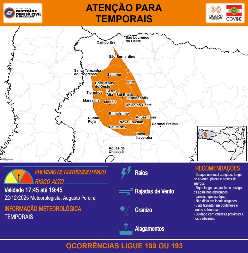 ATENÇÃO – 22/12 17:45 – TEMPORAIS com RAIOS, RAJADAS DE VENTO, GRANIZO e ALAGAMENTOS para os municípios de Bom Jesus do Oeste, Campo Erê, Coronel Freitas, Cunha Porã, Irati, Jardinópolis, Maravilha, Modelo, Nova Erechim, Nova Itaberaba, Pinhalzinho, Saltinho, Santa Terezinha do Progresso, Saudades, Serra Alta, Sul Brasil, São Bernardino, São Lourenço do Oeste, Tigrinhos, União do Oeste, Águas Frias e Águas de Chapecó nas próximas 2 horas. Ocorrências ligue 199 ou 193.
