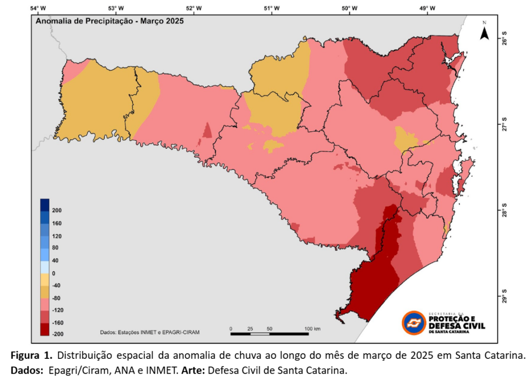 Março marca início do Outono, mas como ainda possui algumas marcas de verão, é um mês que costuma ter acumulados expressivos de chuva. Porém, em 2025, o mês foi bem atípico em Santa Catarina, com chuva abaixo do esperado em todo o estado. De forma geral, os volumes ficaram entre 50 e 100 mm ao longo do mês, com algumas áreas do Planalto Norte, do Baixo Vale do Itajaí e da Grande Florianópolis, pouco acima dos 100 mm.