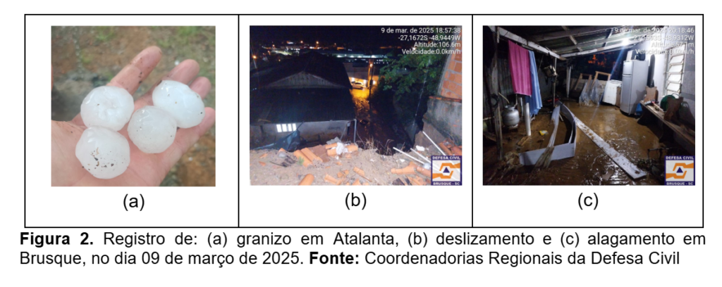 No dia 09 de março, a passagem de uma frente fria provocou temporais e chuva intensa, com alguns deles sendo severos, especialmente entre o Litoral Norte e o Vale do Itajaí. Nesse dia, houve registro de granizo severo no município de Atalanta, no Alto Vale (Figura 2a), e ocorrências de alagamentos e deslizamentos no município de Brusque, no Médio Vale (Figuras 2b e 2c).