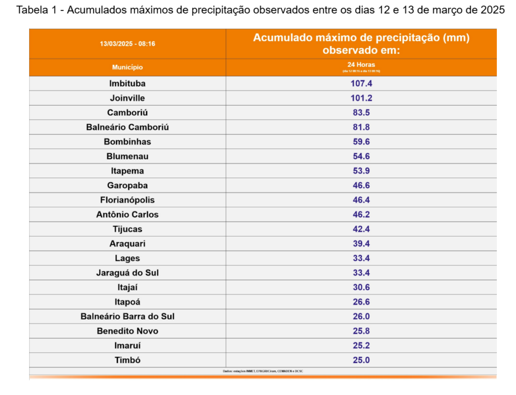 Já entre os dias 12 e 13 de março, houve ocorrência de chuva intensa, especialmente no litoral catarinense. Nesse evento, foram registrados acumulados superiores a 100 mm em Imbituba, no Litoral Sul, e em Joinville, no Litoral Norte (Tabela 1).