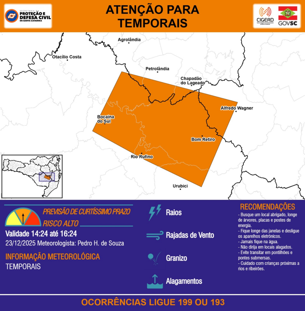 ATENÇÃO – 23/12 14:24 – TEMPORAIS com RAIOS, RAJADAS DE VENTO, GRANIZO e ALAGAMENTOS para os municípios de Agrolândia, Alfredo Wagner, Bocaina do Sul, Bom Retiro, Chapadão do Lageado, Otacílio Costa, Petrolândia, Rio Rufino e Urubici nas próximas 2 horas. Ocorrências ligue 199 ou 193.
