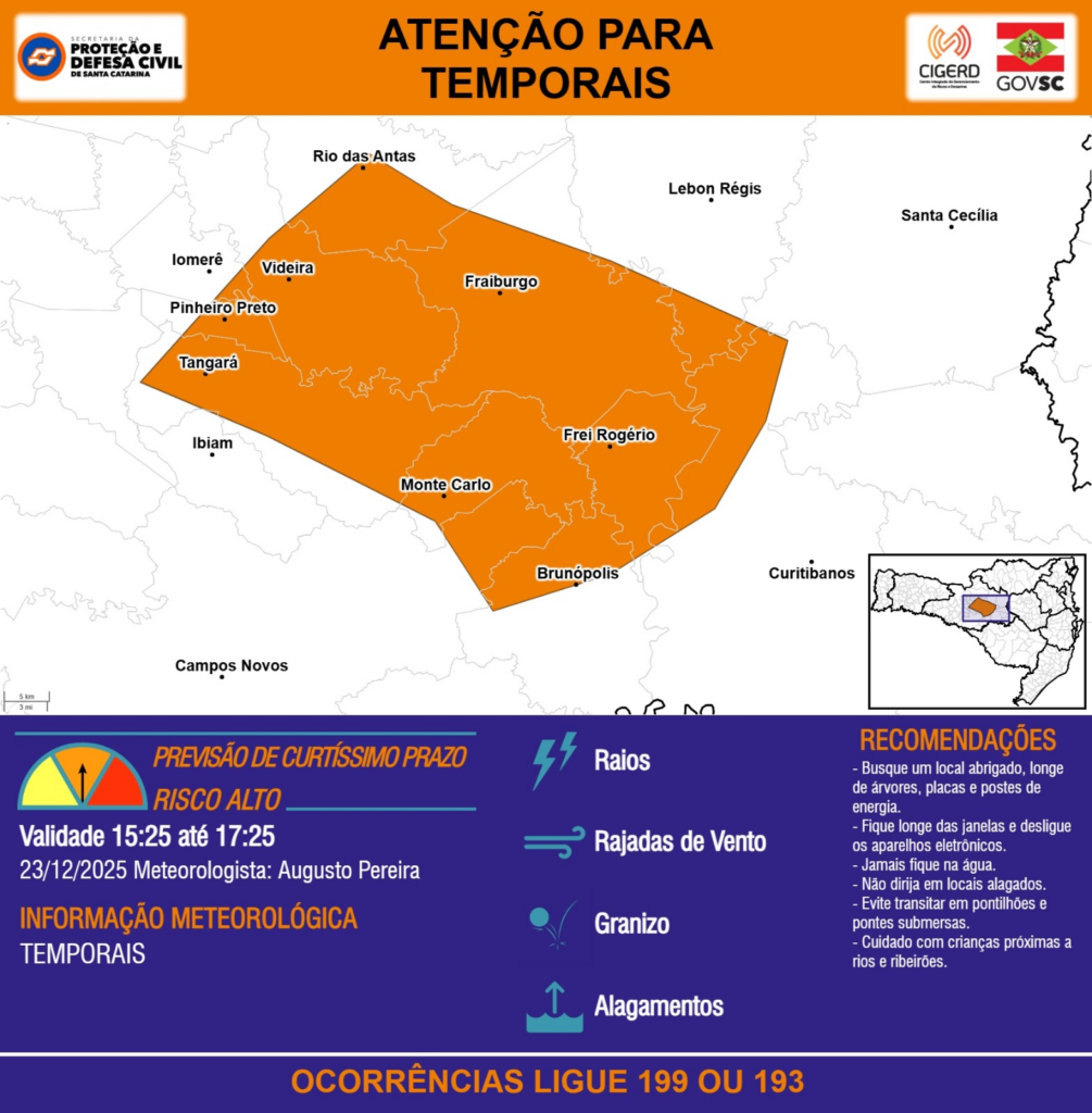 ATENÇÃO – 23/12 15:25 – TEMPORAIS com RAIOS, RAJADAS DE VENTO, GRANIZO e ALAGAMENTOS para os municípios de Brunópolis, Campos Novos, Curitibanos, Fraiburgo, Frei Rogério, Ibiam, Iomerê, Lebon Régis, Monte Carlo, Pinheiro Preto, Rio das Antas, Santa Cecília, Tangará e Videira nas próximas 2 horas. Ocorrências ligue 199 ou 193.