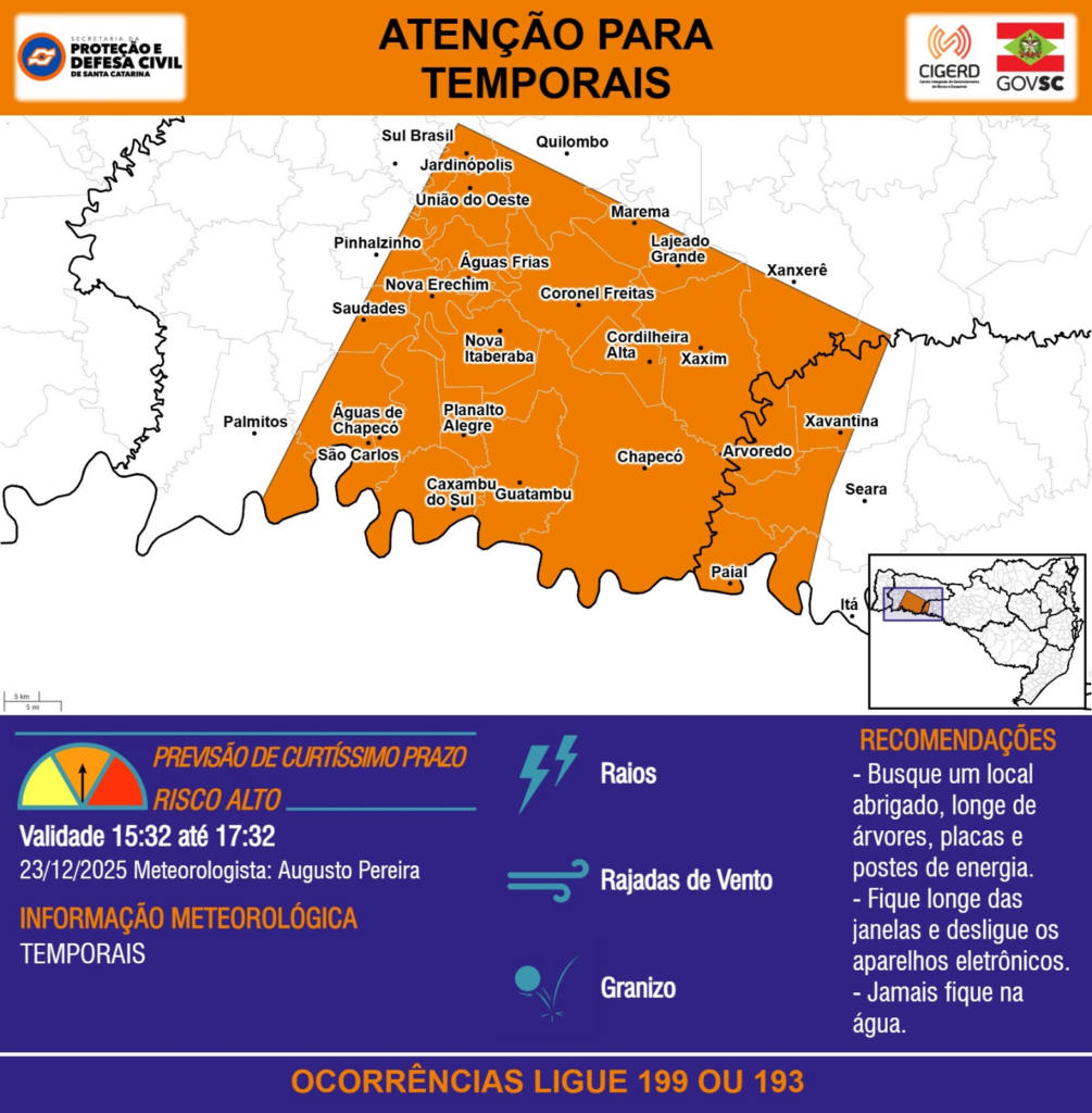 ATENÇÃO – 23/12 15:32 – TEMPORAIS com RAIOS, RAJADAS DE VENTO e GRANIZO para os municípios de Arvoredo, Caxambu do Sul, Chapecó, Cordilheira Alta, Coronel Freitas, Guatambu, Itá, Jardinópolis, Lajeado Grande, Marema, Nova Erechim, Nova Itaberaba, Paial, Palmitos, Pinhalzinho, Planalto Alegre, Quilombo, Saudades, Seara, Sul Brasil, São Carlos, União do Oeste, Xanxerê, Xavantina, Xaxim, Águas Frias e Águas de Chapecó nas próximas 2 horas. Ocorrências ligue 199 ou 193.