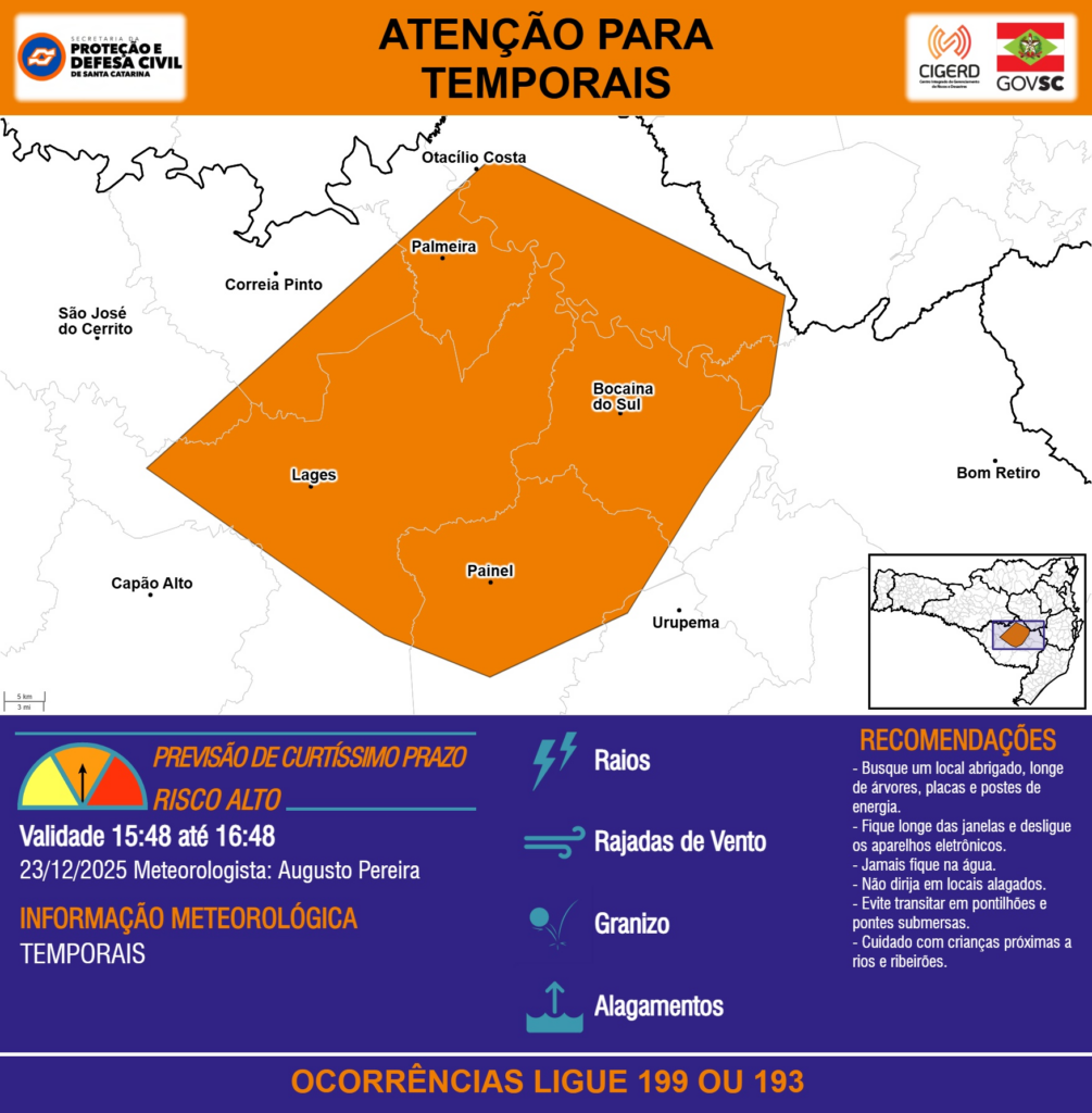 ATENÇÃO – 23/12 15:48 – TEMPORAIS com RAIOS, RAJADAS DE VENTO, GRANIZO e ALAGAMENTOS para os municípios de Bocaina do Sul, Bom Retiro, Capão Alto, Correia Pinto, Lages, Otacílio Costa, Painel, Palmeira, São José do Cerrito e Urupema na próxima hora. Ocorrências ligue 199 ou 193.