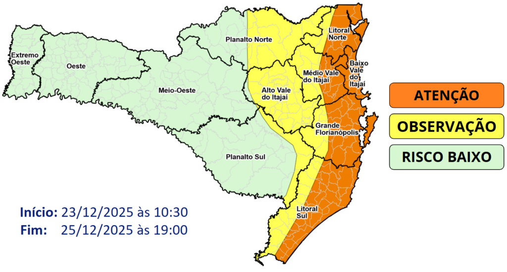A massa de ar quente atuante nos últimos dias, mantém a condição de calor intenso durante as tardes entre esta terça (23) e a quinta-feira (25). em SC. As noites seguem abafadas e as tardes com temperaturas máximas acima dos 30°C em todas as regiões, oscilando entre 35°C e 38°C no Litoral e Vale do Itajaí. Desta forma o risco é moderado a alto para problemas relacionados ao desconforto térmico, desidratação e agravamento de doenças cardiorrespiratórias.