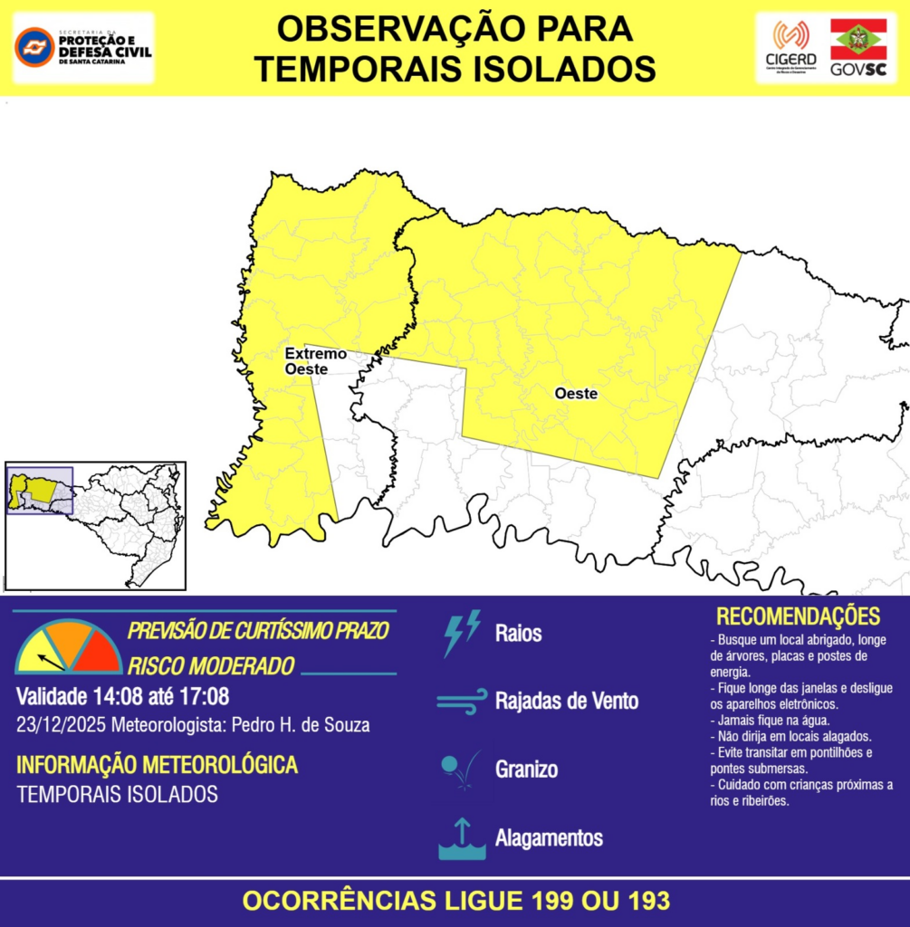 OBSERVAÇÃO – 23/12 14:08 – TEMPORAIS ISOLADOS com RAIOS, RAJADAS DE VENTO, GRANIZO e ALAGAMENTOS pontuais para as regiões do Extremo Oeste e Oeste nas próximas 3 horas. Ocorrências ligue 199 ou 193.