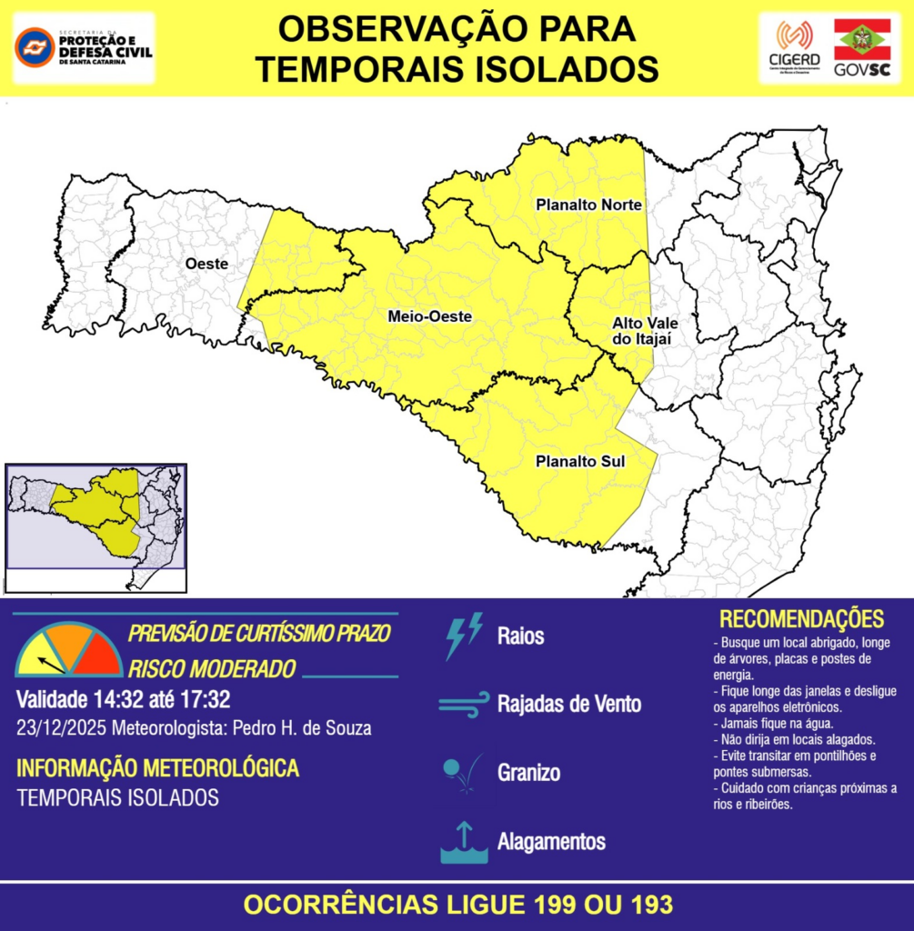 OBSERVAÇÃO – 23/12 14:32 – TEMPORAIS ISOLADOS com RAIOS, RAJADAS DE VENTO, GRANIZO e ALAGAMENTOS pontuais para as regiões do Oeste, Meio-Oeste, Planalto Norte, Planalto Sul e Alto Vale do Itajaí nas próximas 3 horas. Ocorrências ligue 199 ou 193.