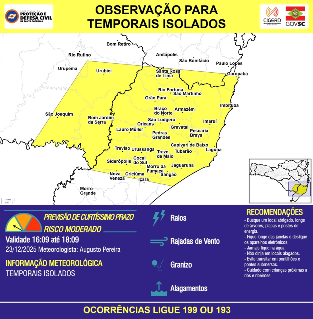 OBSERVAÇÃO – 23/12 16:09 – TEMPORAIS ISOLADOS com RAIOS, RAJADAS DE VENTO, GRANIZO e ALAGAMENTOS pontuais para os municípios de Anitápolis, Armazém, Bom Jardim da Serra, Bom Retiro, Braço do Norte, Capivari de Baixo, Cocal do Sul, Criciúma, Garopaba, Gravatal, Grão Pará, Imaruí, Imbituba, Içara, Jaguaruna, Laguna, Lauro Müller, Morro Grande, Morro da Fumaça, Nova Veneza, Orleans, Paulo Lopes, Pedras Grandes, Pescaria Brava, Rio Fortuna, Rio Rufino, Sangão, Santa Rosa de Lima, Siderópolis, São Bonifácio, São Joaquim, São Ludgero, São Martinho, Treviso, Treze de Maio, Tubarão, Urubici, Urupema e Urussanga nas próximas 2 horas. Ocorrências ligue 199 ou 193.
