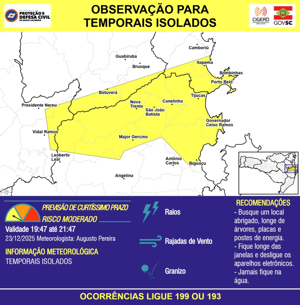 OBSERVAÇÃO – 23/12 19:47 – TEMPORAIS ISOLADOS com RAIOS, RAJADAS DE VENTO e GRANIZO para os municípios de Angelina, Antônio Carlos, Biguaçu, Bombinhas, Botuverá, Brusque, Camboriú, Canelinha, Governador Celso Ramos, Guabiruba, Itapema, Leoberto Leal, Major Gercino, Nova Trento, Porto Belo, Presidente Nereu, São João Batista, Tijucas e Vidal Ramos nas próximas 2 horas. Ocorrências ligue 199 ou 193.