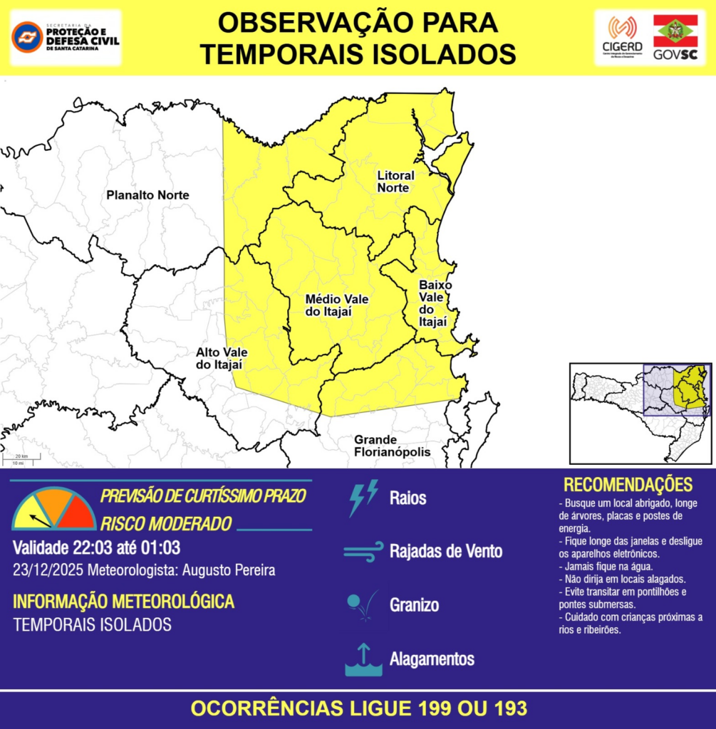 OBSERVAÇÃO – 23/12 22:03 – TEMPORAIS ISOLADOS com RAIOS, RAJADAS DE VENTO, GRANIZO e ALAGAMENTOS pontuais para as regiões do Planalto Norte, Litoral Norte, Grande Florianópolis, Baixo, Médio e Alto Vale do Itajaí nas próximas 3 horas. Ocorrências ligue 199 ou 193.