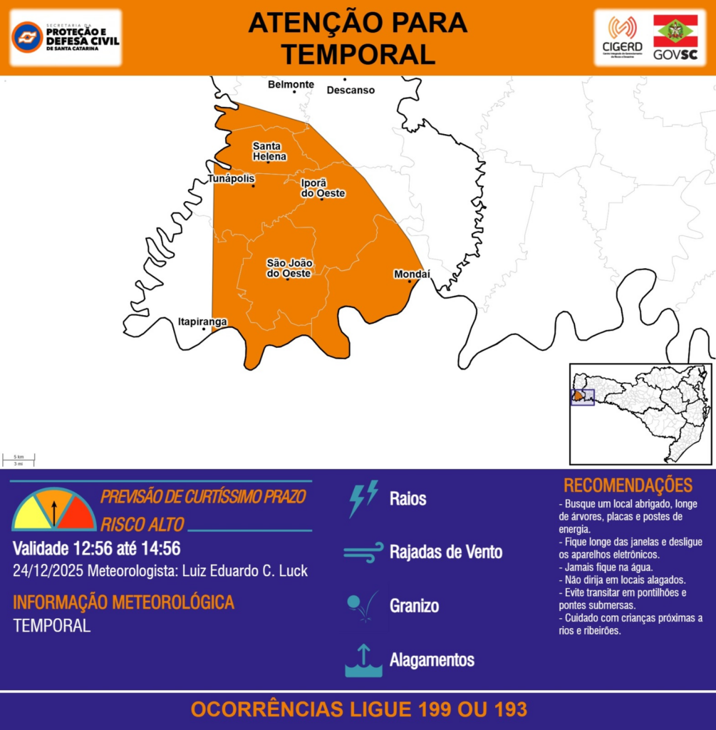 ATENÇÃO – 24/12 12:56 – TEMPORAL com RAIOS, RAJADAS DE VENTO, GRANIZO e ALAGAMENTOS para os municípios de Belmonte, Descanso, Iporã do Oeste, Itapiranga, Mondaí, Santa Helena, São João do Oeste e Tunápolis nas próximas 2 horas. Ocorrências ligue 199 ou 193.