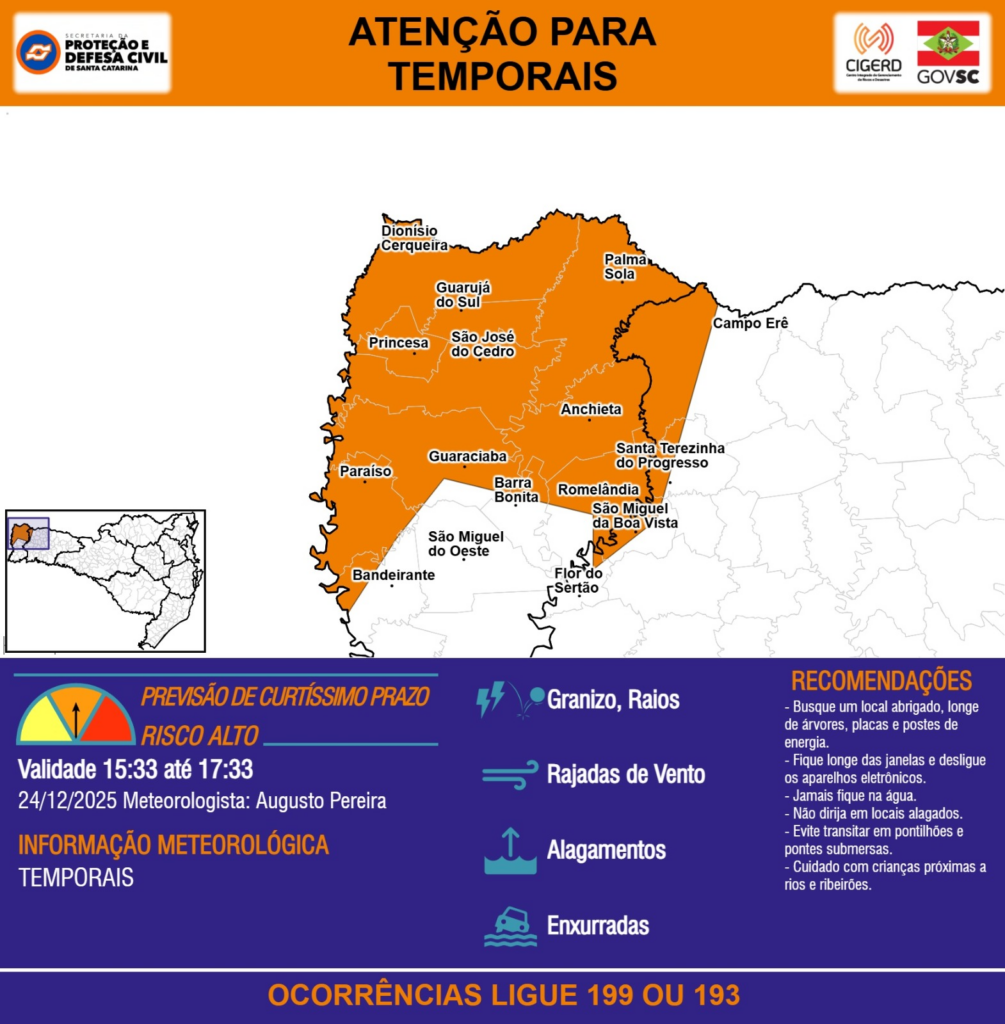 ATENÇÃO – 24/12 15:33 – TEMPORAIS com RAJADAS DE VENTO, ALAGAMENTOS, GRANIZO, RAIOS e risco de ENXURRADAS para os municípios de Anchieta, Bandeirante, Barra Bonita, Campo Erê, Dionísio Cerqueira, Flor do Sertão, Guaraciaba, Guarujá do Sul, Palma Sola, Paraíso, Princesa, Romelândia, Santa Terezinha do Progresso, São José do Cedro, São Miguel da Boa Vista e São Miguel do Oeste nas próximas 2 horas. Ocorrências ligue 199 ou 193.