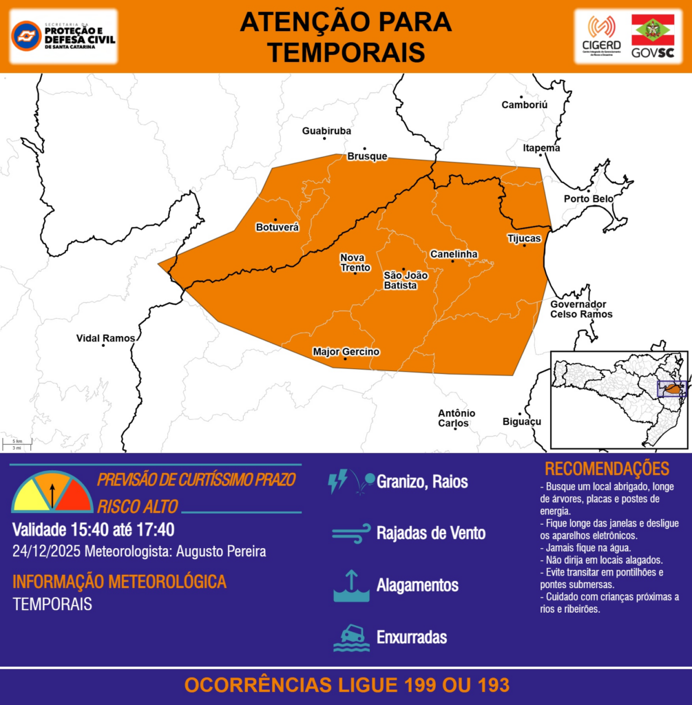 ATENÇÃO – 24/12 15:40 – TEMPORAIS com RAJADAS DE VENTO, ALAGAMENTOS, GRANIZO, RAIOS e risco de ENXURRADAS para os municípios de Antônio Carlos, Biguaçu, Botuverá, Brusque, Camboriú, Canelinha, Governador Celso Ramos, Guabiruba, Itapema, Major Gercino, Nova Trento, Porto Belo, São João Batista, Tijucas e Vidal Ramos nas próximas 2 horas. Ocorrências ligue 199 ou 193.