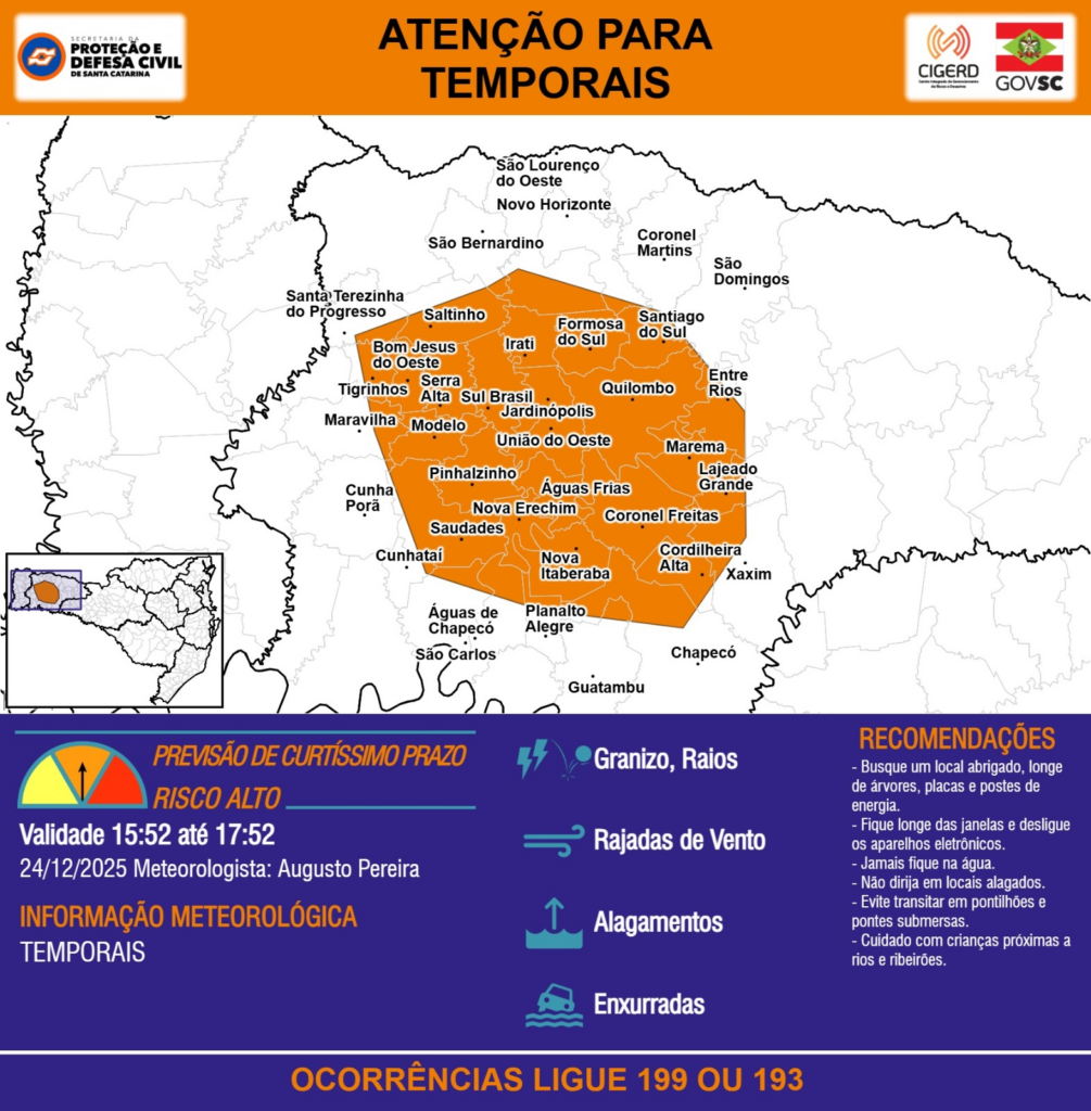 ATENÇÃO – 24/12 15:52 – TEMPORAIS com RAJADAS DE VENTO, ALAGAMENTOS, GRANIZO, RAIOS e risco de ENXURRADAS para os municípios de Bom Jesus do Oeste, Chapecó, Cordilheira Alta, Coronel Freitas, Coronel Martins, Cunha Porã, Cunhataí, Entre Rios, Formosa do Sul, Guatambu, Irati, Jardinópolis, Lajeado Grande, Maravilha, Marema, Modelo, Nova Erechim, Nova Itaberaba, Novo Horizonte, Pinhalzinho, Planalto Alegre, Quilombo, Saltinho, Santa Terezinha do Progresso, Santiago do Sul, Saudades, Serra Alta, Sul Brasil, São Bernardino, São Carlos, São Domingos, São Lourenço do Oeste, Tigrinhos, União do Oeste, Xaxim, Águas Frias e Águas de Chapecó nas próximas 2 horas. Ocorrências ligue 199 ou 193.