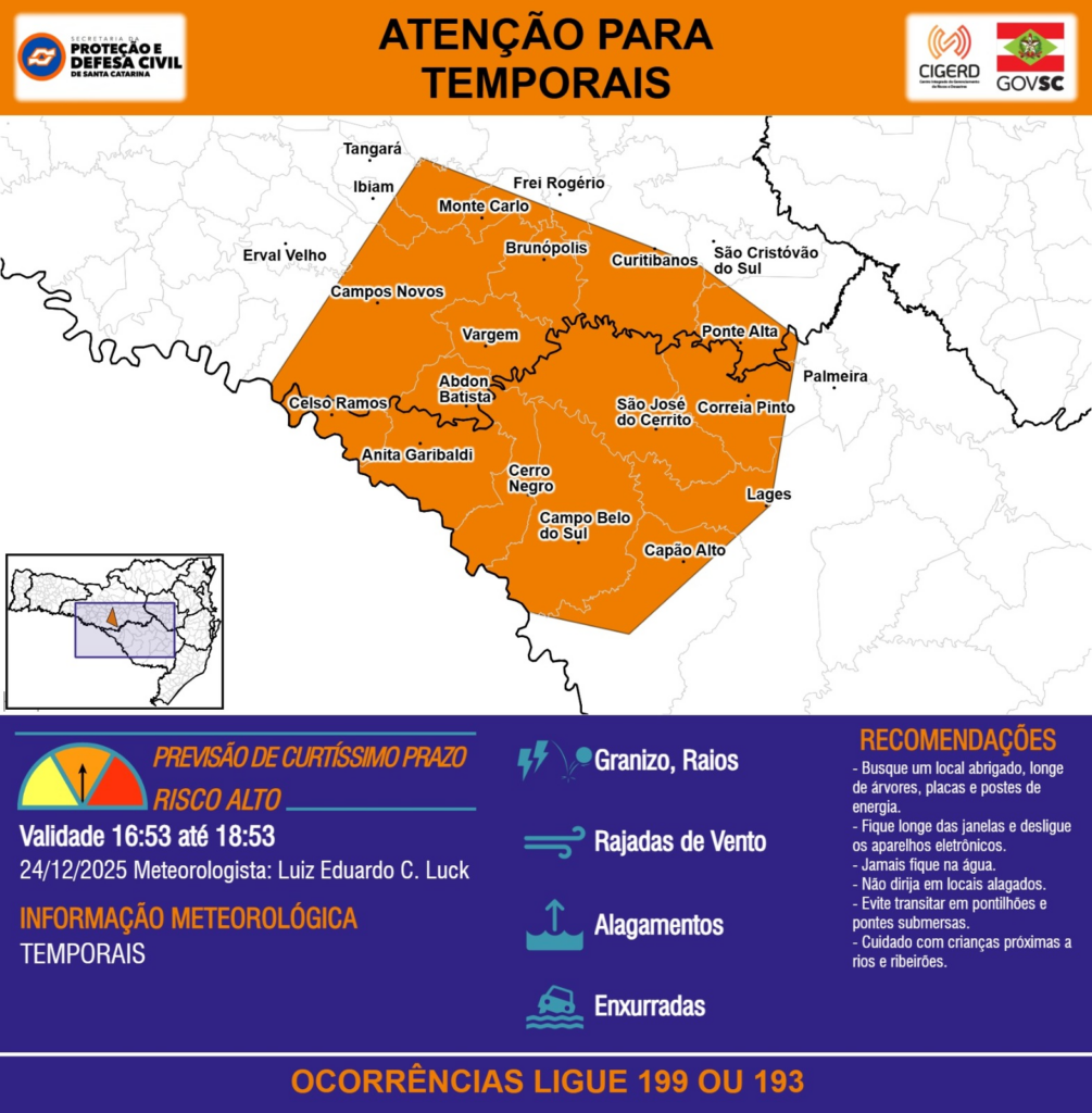 ATENÇÃO – 24/12 16:53 – TEMPORAIS com RAJADAS DE VENTO, ALAGAMENTOS, GRANIZO, RAIOS e risco de ENXURRADAS para os municípios de Abdon Batista, Anita Garibaldi, Brunópolis, Campo Belo do Sul, Campos Novos, Capão Alto, Celso Ramos, Cerro Negro, Correia Pinto, Curitibanos, Erval Velho, Frei Rogério, Ibiam, Lages, Monte Carlo, Palmeira, Ponte Alta, São Cristóvão do Sul, São José do Cerrito, Tangará e Vargem nas próximas 2 horas. Ocorrências ligue 199 ou 193.
