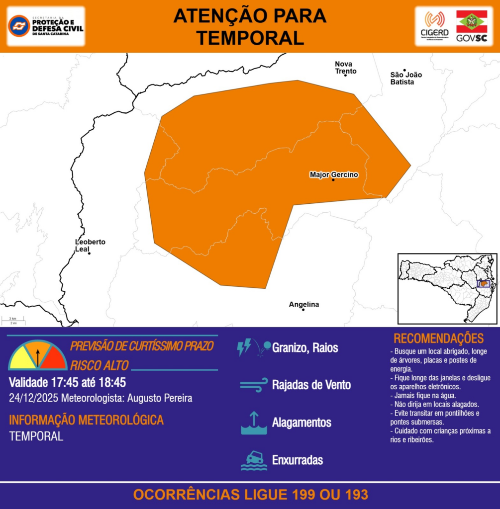 ATENÇÃO – 24/12 17:45 – TEMPORAL com RAJADAS DE VENTO, ALAGAMENTOS, GRANIZO, RAIOS e risco de ENXURRADAS para os municípios de Angelina, Leoberto Leal, Major Gercino, Nova Trento e São João Batista na próxima hora. Ocorrências ligue 199 ou 193.