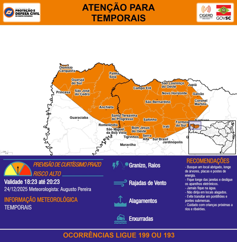 ATENÇÃO – 24/12 18:23 – TEMPORAIS com RAJADAS DE VENTO, ALAGAMENTOS, GRANIZO, RAIOS e risco de ENXURRADAS para os municípios de Anchieta, Bom Jesus do Oeste, Campo Erê, Coronel Martins, Dionísio Cerqueira, Formosa do Sul, Galvão, Guaraciaba, Guarujá do Sul, Irati, Jardinópolis, Jupiá, Maravilha, Novo Horizonte, Palma Sola, Princesa, Quilombo, Romelândia, Saltinho, Santa Terezinha do Progresso, Santiago do Sul, Serra Alta, Sul Brasil, São Bernardino, São José do Cedro, São Lourenço do Oeste, São Miguel da Boa Vista e Tigrinhos nas próximas 2 horas. Ocorrências ligue 199 ou 193.