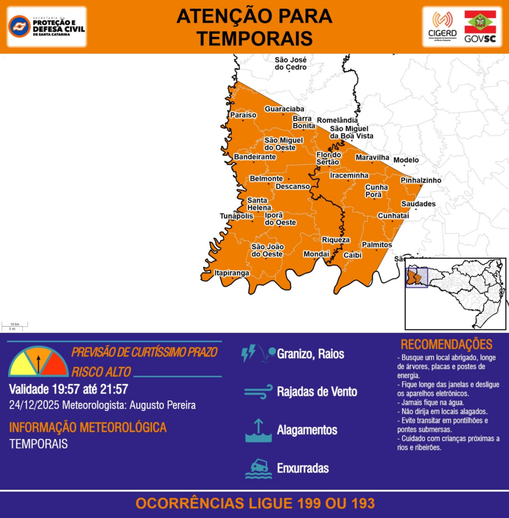 ATENÇÃO – 24/12 19:57 – TEMPORAIS com RAJADAS DE VENTO, ALAGAMENTOS, GRANIZO, RAIOS e risco de ENXURRADAS para os municípios de Bandeirante, Barra Bonita, Belmonte, Caibi, Cunha Porã, Cunhataí, Descanso, Flor do Sertão, Guaraciaba, Iporã do Oeste, Iraceminha, Itapiranga, Maravilha, Modelo, Mondaí, Palmitos, Paraíso, Pinhalzinho, Riqueza, Romelândia, Santa Helena, Saudades, São Carlos, São José do Cedro, São João do Oeste, São Miguel da Boa Vista, São Miguel do Oeste e Tunápolis nas próximas 2 horas. Ocorrências ligue 199 ou 193.