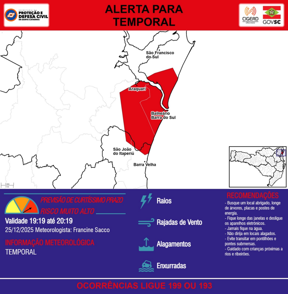 ALERTA – 25/12 19:19 – TEMPORAL com RAIOS, RAJADAS DE VENTO, ALAGAMENTOS e risco de ENXURRADAS para os municípios de Araquari, Balneário Barra do Sul, Barra Velha, São Francisco do Sul e São João do Itaperiú na próxima hora. Ocorrências ligue 199 ou 193.