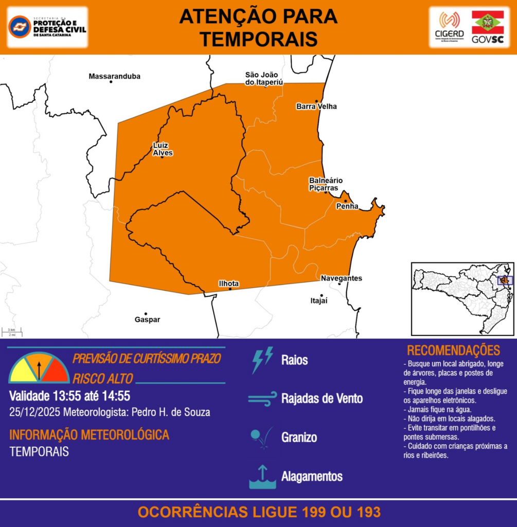 ATENÇÃO – 25/12 13:55 – TEMPORAIS com RAIOS, RAJADAS DE VENTO, GRANIZO e ALAGAMENTOS para os municípios de Balneário Piçarras, Barra Velha, Gaspar, Ilhota, Itajaí, Luiz Alves, Massaranduba, Navegantes, Penha e São João do Itaperiú na próxima hora. Ocorrências ligue 199 ou 193.