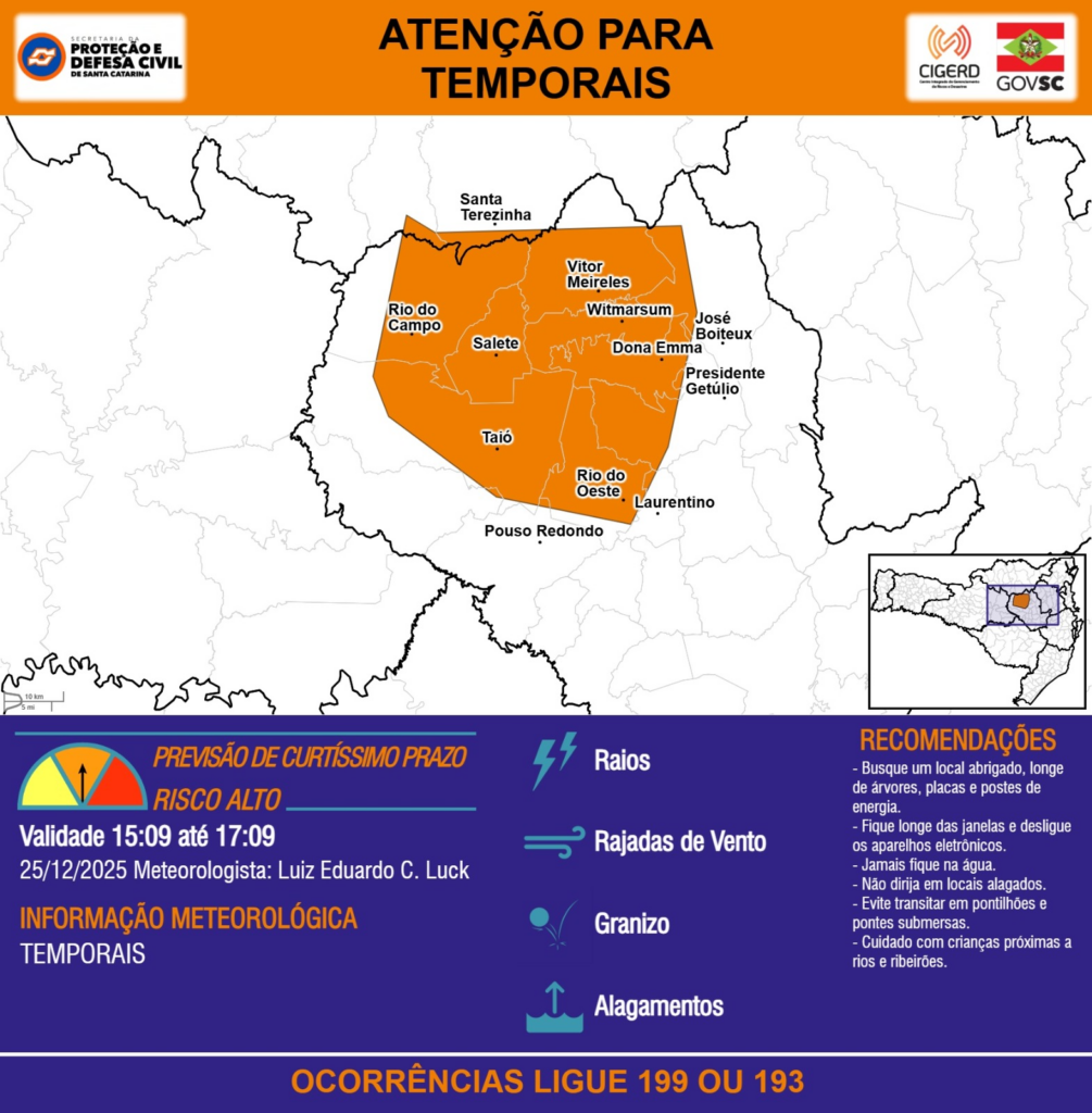 ATENÇÃO – 25/12 15:09 – TEMPORAIS com RAIOS, RAJADAS DE VENTO, GRANIZO e ALAGAMENTOS para os municípios de Dona Emma, Itaiópolis, José Boiteux, Laurentino, Papanduva, Pouso Redondo, Presidente Getúlio, Rio do Campo, Rio do Oeste, Salete, Santa Terezinha, Taió, Vitor Meireles e Witmarsum nas próximas 2 horas. Ocorrências ligue 199 ou 193.