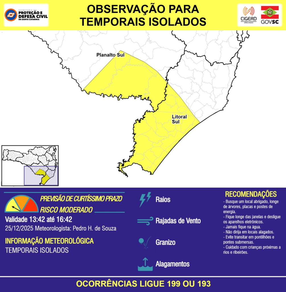 OBSERVAÇÃO – 25/12 13:42 – TEMPORAIS ISOLADOS com RAIOS, RAJADAS DE VENTO, GRANIZO e ALAGAMENTOS pontuais para áreas das regiões do Planalto Sul e Litoral Sul nas próximas 3 horas. Ocorrências ligue 199 ou 193.