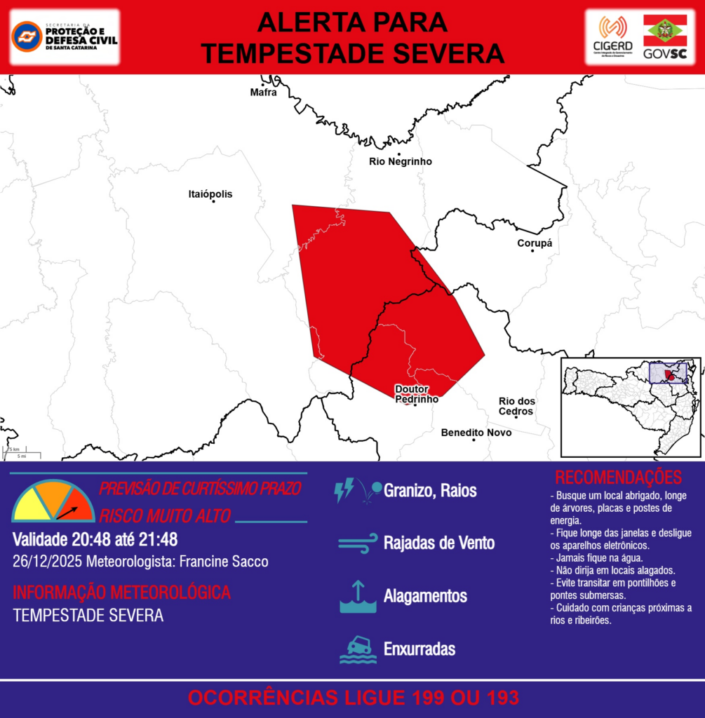 ALERTA – 26/12 20:48 – TEMPESTADE SEVERA com RAJADAS DE VENTO, ALAGAMENTOS, GRANIZO, RAIOS e risco de ENXURRADAS para as regiões do Planalto Norte, Litoral Norte e Médio Vale do Itajaí na próxima hora. Ocorrências ligue 199 ou 193.
