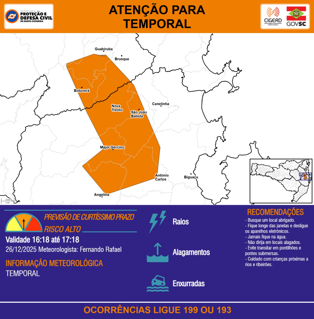 ATENÇÃO – 26/12 16:18 – TEMPORAL com RAIOS, ALAGAMENTOS e risco de ENXURRADAS para os municípios de Angelina, Antônio Carlos, Biguaçu, Botuverá, Brusque, Canelinha, Guabiruba, Major Gercino, Nova Trento e São João Batista na próxima hora. Ocorrências ligue 199 ou 193.