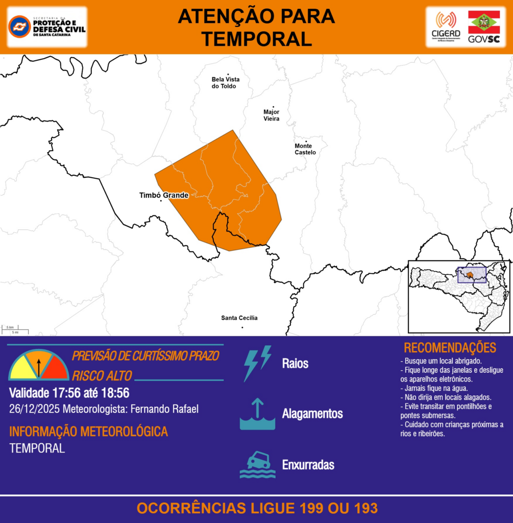ATENÇÃO – 26/12 17:56 – TEMPORAL com RAIOS, ALAGAMENTOS e risco de ENXURRADAS para os municípios de Bela Vista do Toldo, Canoinhas, Major Vieira, Monte Castelo e Santa Cecília na próxima hora. Ocorrências ligue 199 ou 193.