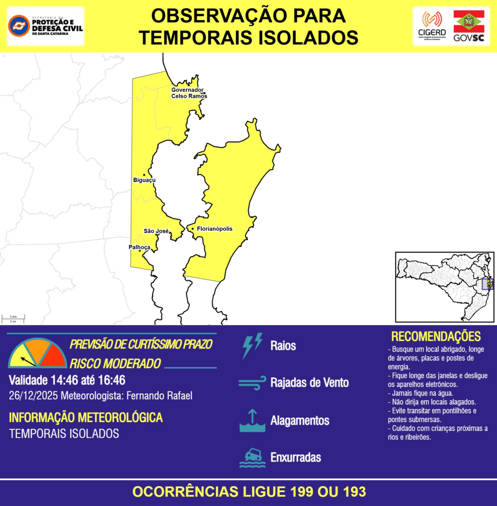 OBSERVAÇÃO – 26/12 14:46 – TEMPORAIS ISOLADOS com RAIOS, RAJADAS DE VENTO, ALAGAMENTOS pontuais e risco de ENXURRADAS para os municípios de Biguaçu, Florianópolis, Governador Celso Ramos, Palhoça, São José e Tijucas nas próximas 2 horas. Ocorrências ligue 199 ou 193.
