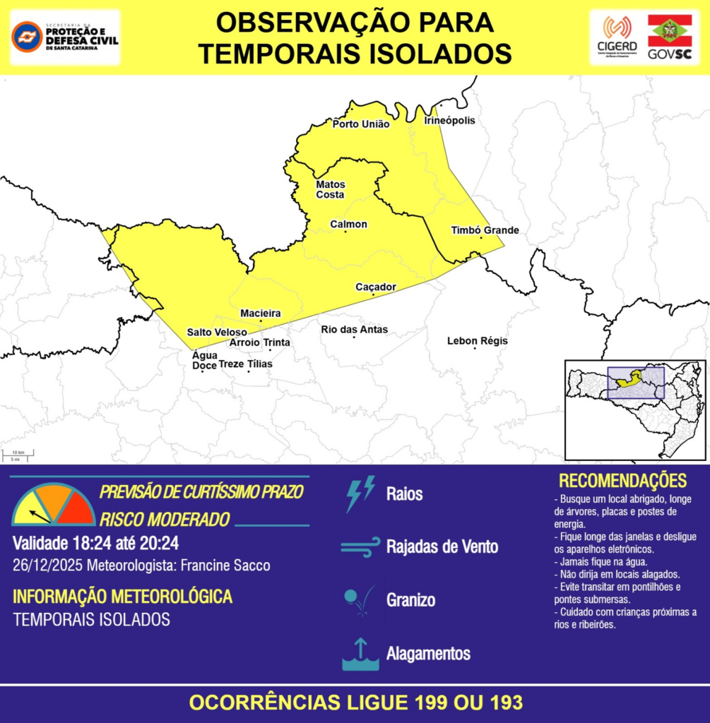 OBSERVAÇÃO – 26/12 18:24 – TEMPORAIS ISOLADOS com RAIOS, RAJADAS DE VENTO, GRANIZO e ALAGAMENTOS pontuais para as regiões do Meio-Oeste e Planalto Norte nas próximas 2 horas. Ocorrências ligue 199 ou 193.