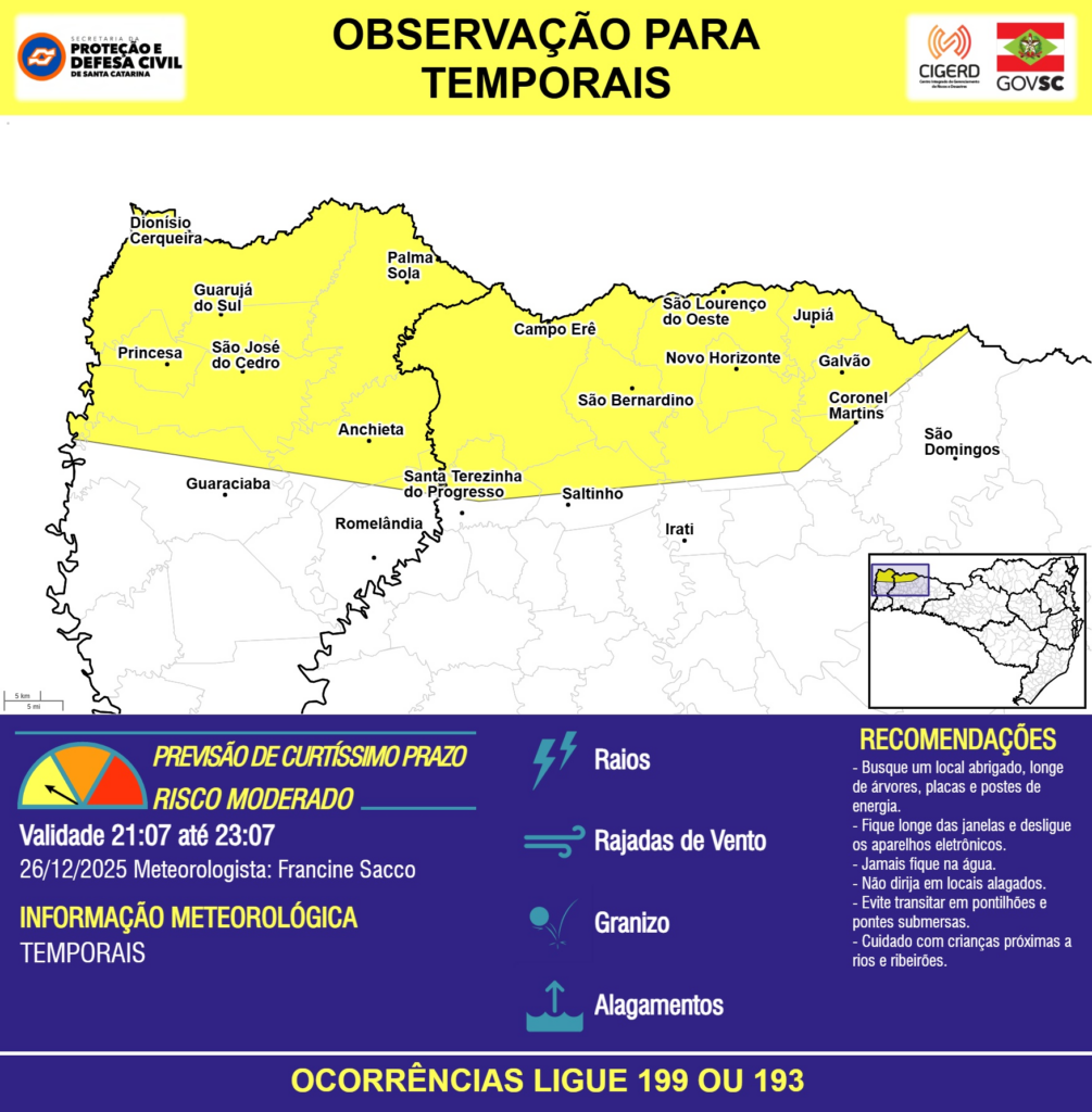 OBSERVAÇÃO – 26/12 21:07 – TEMPORAIS com RAIOS, RAJADAS DE VENTO, GRANIZO e ALAGAMENTOS pontuais para as regiões do Extremo Oeste e Oeste nas próximas 2 horas. Ocorrências ligue 199 ou 193.