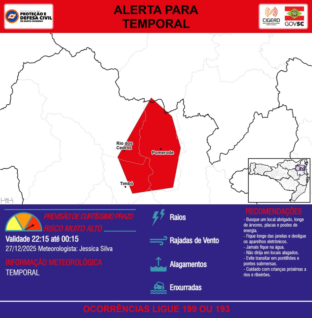 ALERTA – 27/12 22:15 – TEMPORAL com RAIOS, RAJADAS DE VENTO, ALAGAMENTOS e risco de ENXURRADAS para os municípios de Pomerode, Rio dos Cedros e Timbó nas próximas 2 horas. Ocorrências ligue 199 ou 193.