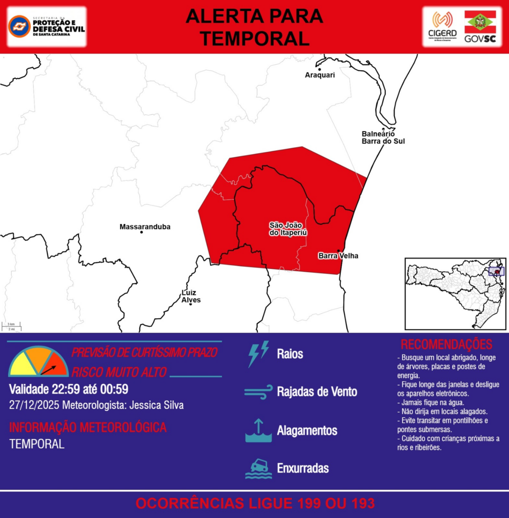 ALERTA – 27/12 22:59 – TEMPORAL com RAIOS, RAJADAS DE VENTO, ALAGAMENTOS e risco de ENXURRADAS para os municípios de Araquari, Balneário Barra do Sul, Barra Velha, Luiz Alves, Massaranduba e São João do Itaperiú nas próximas 2 horas. Ocorrências ligue 199 ou 193.