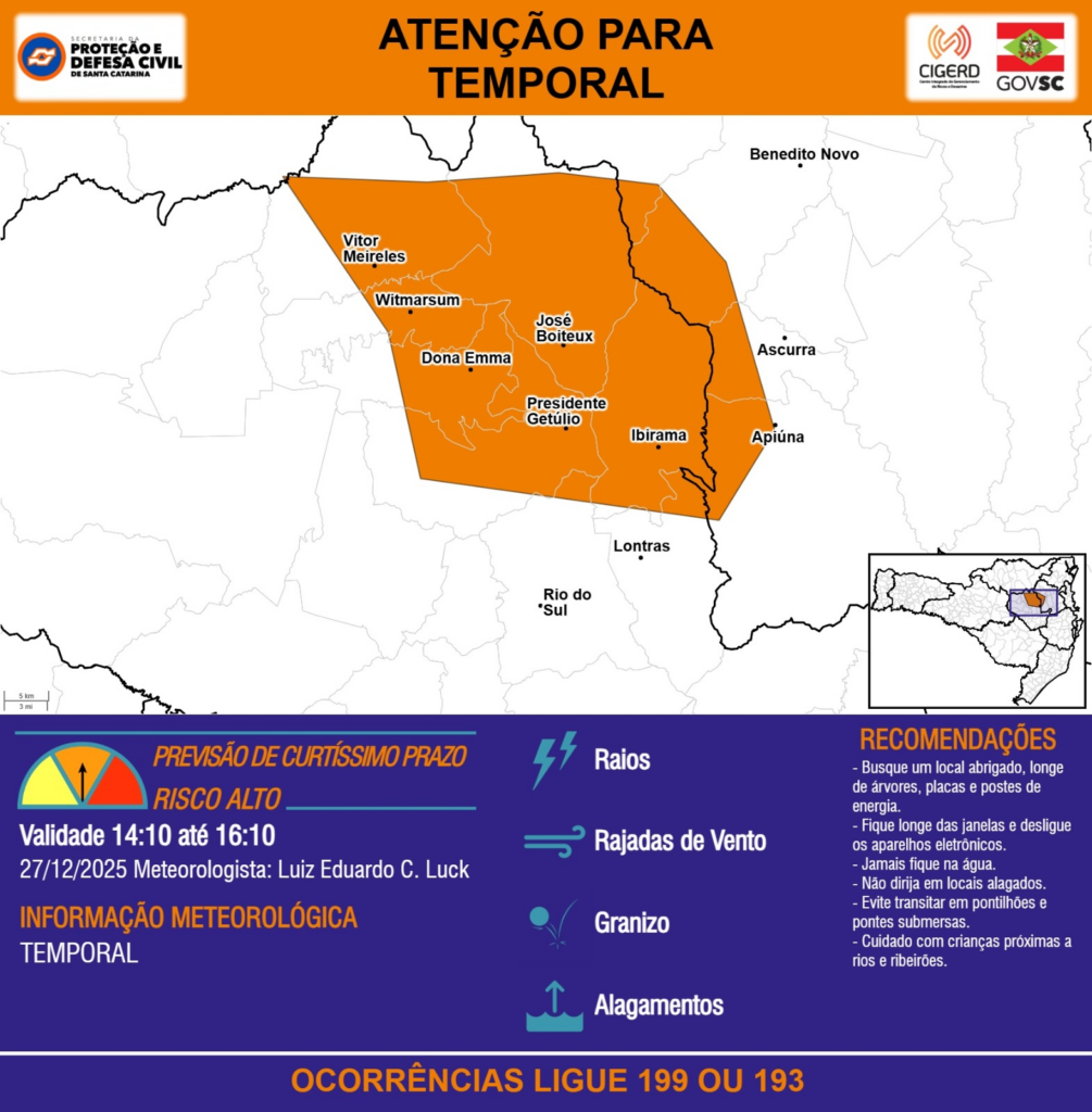 ATENÇÃO – 27/12 14:10 – TEMPORAL com RAIOS, RAJADAS DE VENTO, GRANIZO e ALAGAMENTOS para os municípios de Apiúna, Ascurra, Benedito Novo, Dona Emma, Doutor Pedrinho, Ibirama, José Boiteux, Lontras, Presidente Getúlio, Rio do Sul, Vitor Meireles e Witmarsum nas próximas 2 horas. Ocorrências ligue 199 ou 193.