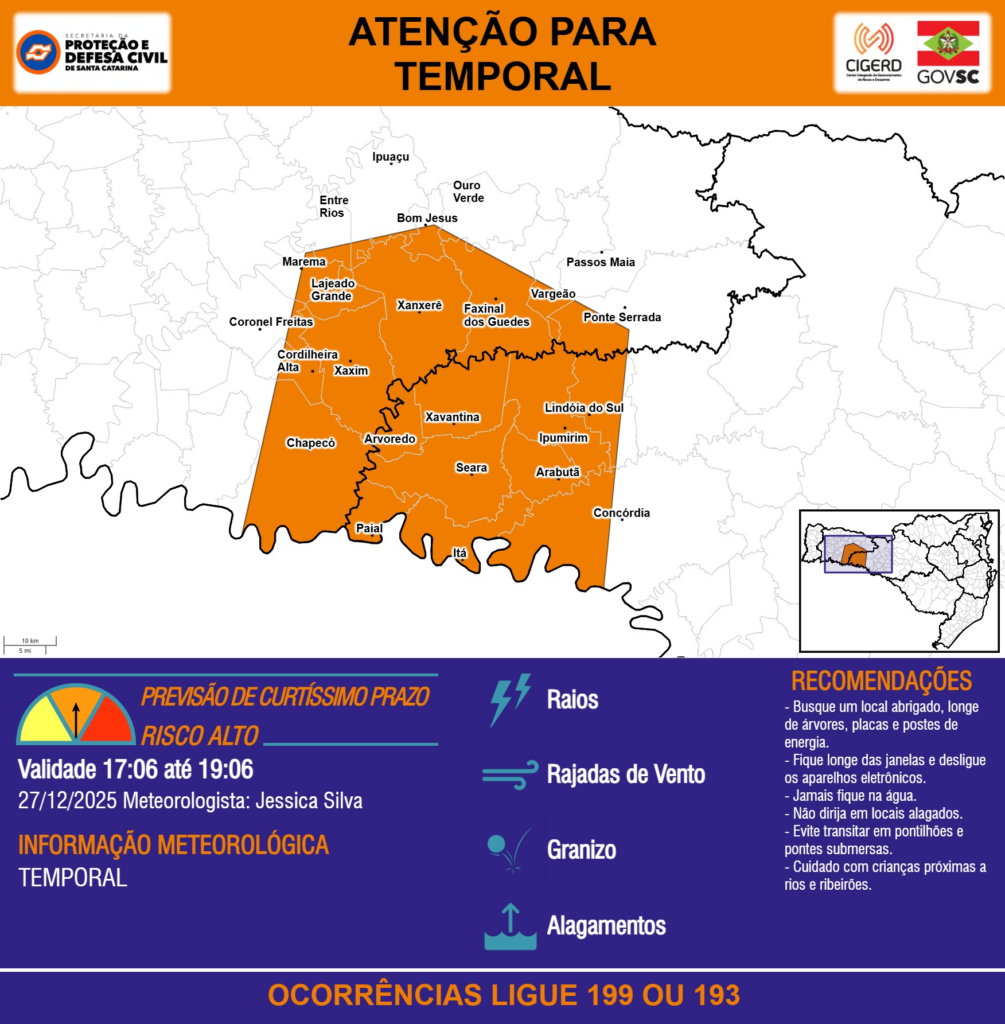 ATENÇÃO – 27/12 17:06 – TEMPORAL com RAIOS, RAJADAS DE VENTO, GRANIZO e ALAGAMENTOS para os municípios de Arabutã, Arvoredo, Bom Jesus, Chapecó, Concórdia, Cordilheira Alta, Coronel Freitas, Entre Rios, Faxinal dos Guedes, Ipuaçu, Ipumirim, Itá, Lajeado Grande, Lindóia do Sul, Marema, Ouro Verde, Paial, Passos Maia, Ponte Serrada, Seara, Vargeão, Xanxerê, Xavantina e Xaxim nas próximas 2 horas. Ocorrências ligue 199 ou 193.