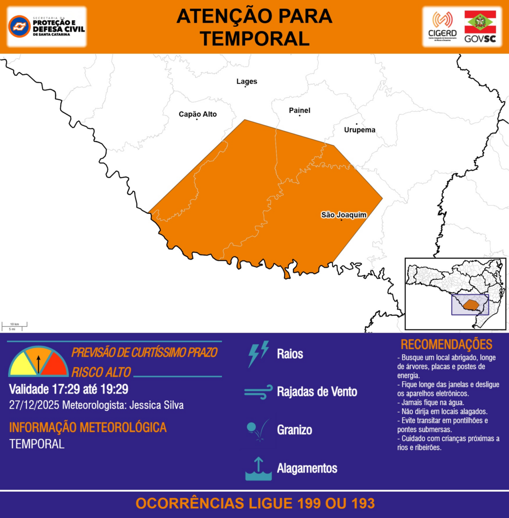 ATENÇÃO – 27/12 17:29 – TEMPORAL com RAIOS, RAJADAS DE VENTO, GRANIZO e ALAGAMENTOS para os municípios de Capão Alto, Lages, Painel, São Joaquim e Urupema nas próximas 2 horas. Ocorrências ligue 199 ou 193.