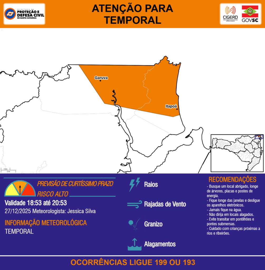 ATENÇÃO – 27/12 18:53 – TEMPORAL com RAIOS, RAJADAS DE VENTO, GRANIZO e ALAGAMENTOS para os municípios de Garuva e Itapoá nas próximas 2 horas. Ocorrências ligue 199 ou 193.