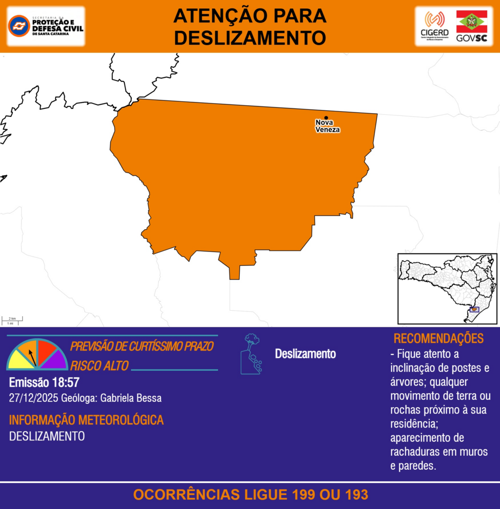 ATENÇÃO – 27/12 18:57 – DESLIZAMENTO para o município de Nova Veneza. Ocorrências ligue 199 ou 193.