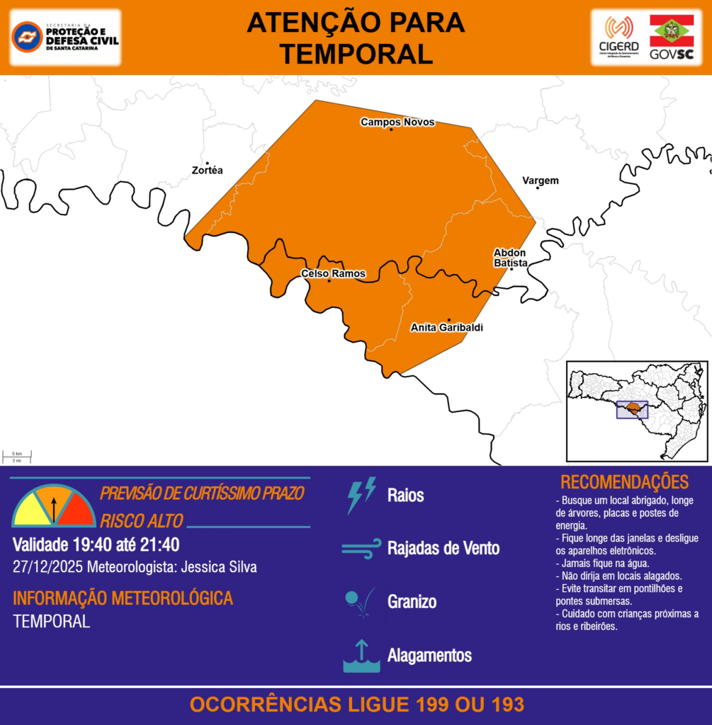 ATENÇÃO – 27/12 19:40 – TEMPORAL com RAIOS, RAJADAS DE VENTO, GRANIZO e ALAGAMENTOS para os municípios de Abdon Batista, Anita Garibaldi, Campos Novos, Celso Ramos, Vargem e Zortéa nas próximas 2 horas. Ocorrências ligue 199 ou 193.