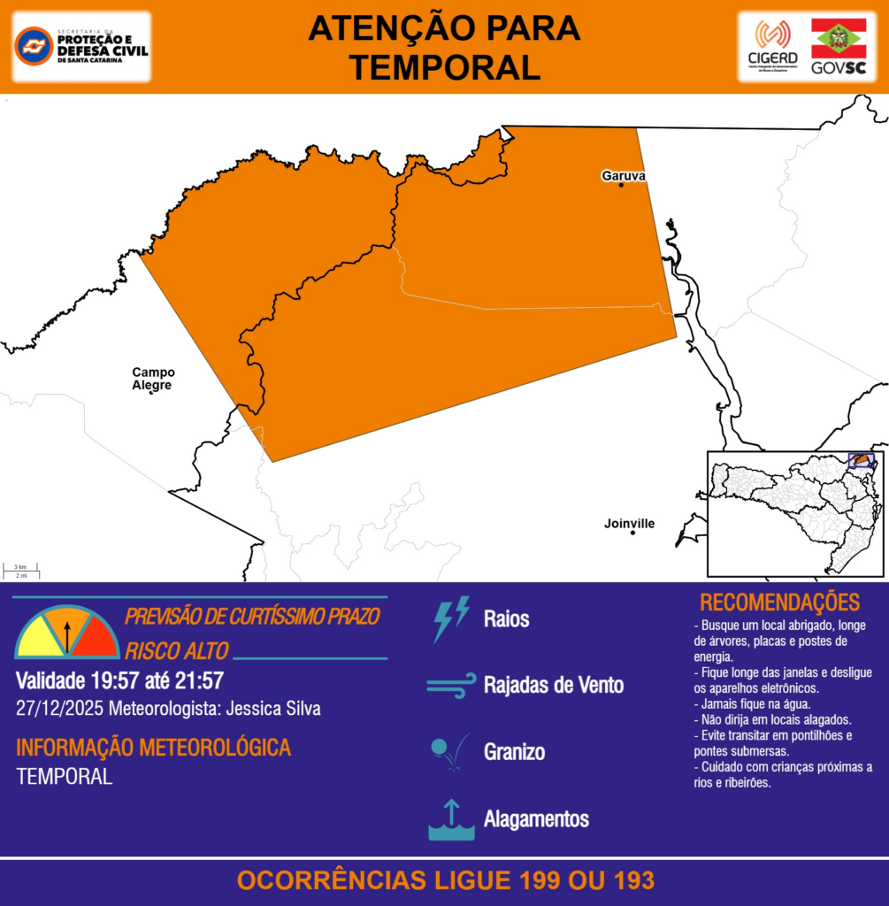 ATENÇÃO – 27/12 19:57 – TEMPORAL com RAIOS, RAJADAS DE VENTO, GRANIZO e ALAGAMENTOS para os municípios de Campo Alegre, Garuva e Joinville nas próximas 2 horas. Ocorrências ligue 199 ou 193.