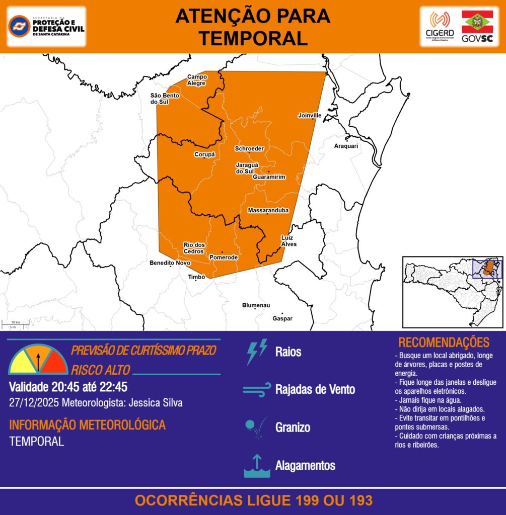 ATENÇÃO – 27/12 20:45 – TEMPORAL com RAIOS, RAJADAS DE VENTO, GRANIZO e ALAGAMENTOS para os municípios de Araquari, Benedito Novo, Blumenau, Campo Alegre, Corupá, Gaspar, Guaramirim, Jaraguá do Sul, Joinville, Luiz Alves, Massaranduba, Pomerode, Rio dos Cedros, Schroeder, São Bento do Sul e Timbó nas próximas 2 horas. Ocorrências ligue 199 ou 193.