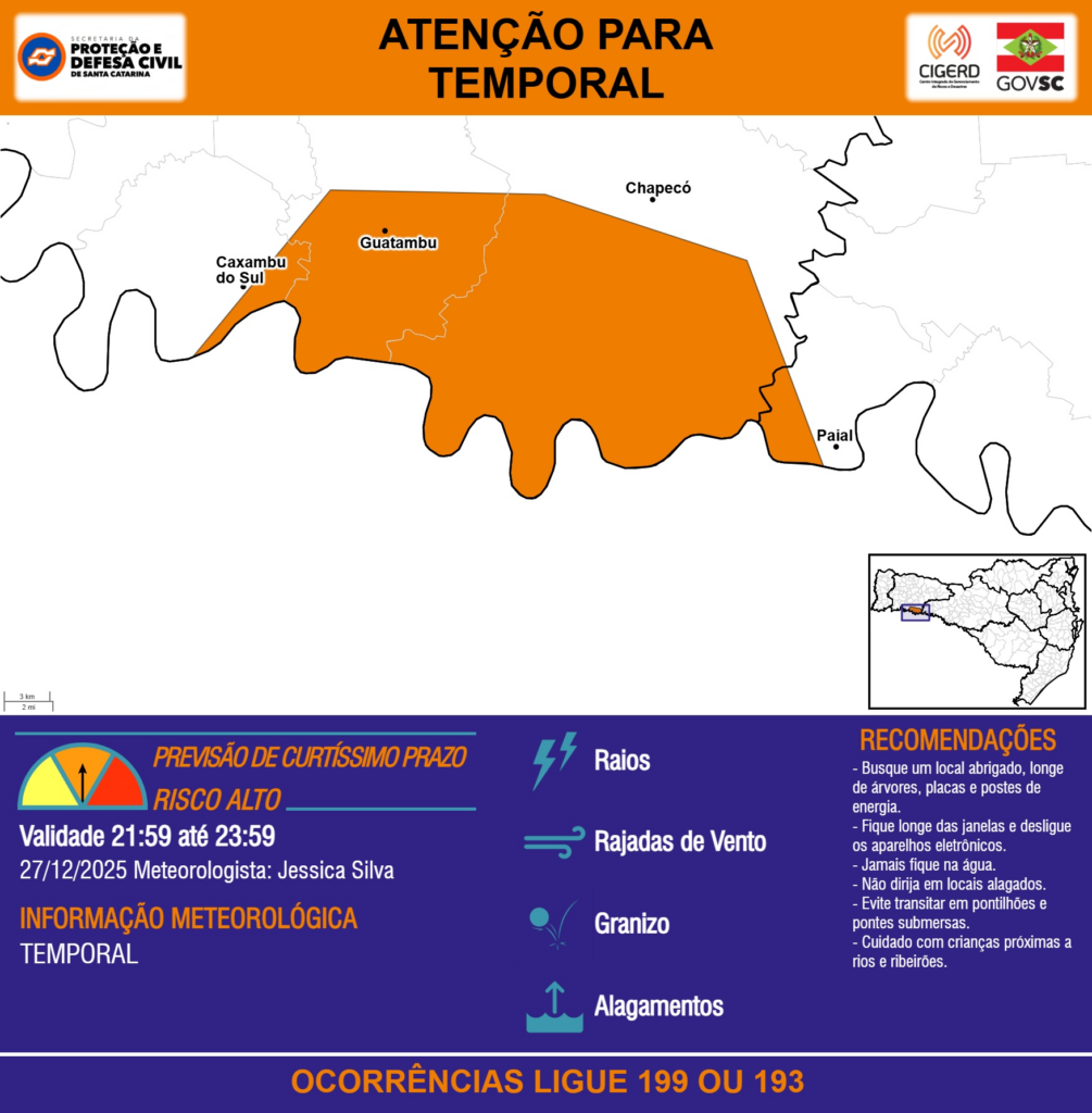 ATENÇÃO – 27/12 21:59 – TEMPORAL com RAIOS, RAJADAS DE VENTO, GRANIZO e ALAGAMENTOS para os municípios de Caxambu do Sul, Chapecó, Guatambu e Paial nas próximas 2 horas. Ocorrências ligue 199 ou 193.