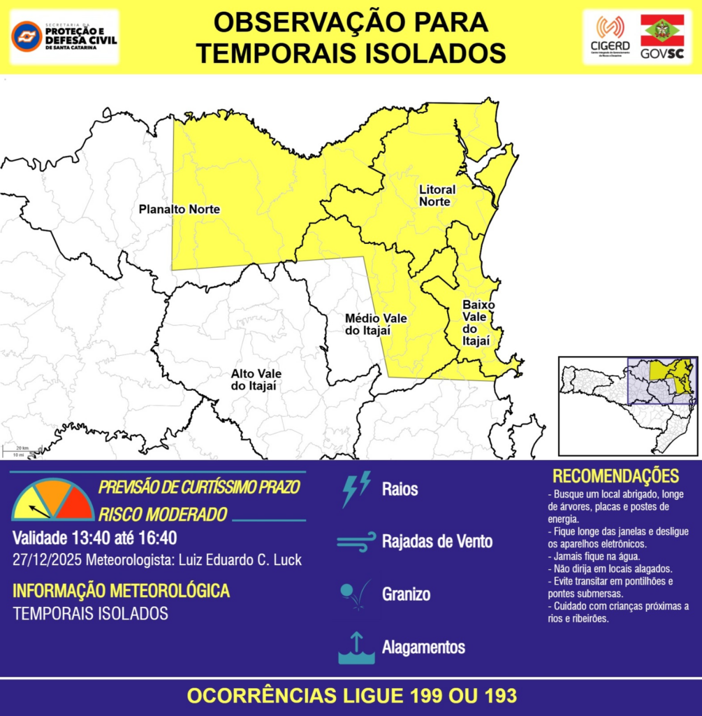 OBSERVAÇÃO – 27/12 13:40 – TEMPORAIS ISOLADOS com RAIOS, RAJADAS DE VENTO, GRANIZO e ALAGAMENTOS pontuais para as regiões do Planalto Norte, Litoral Norte, Grande Florianópolis, Baixo, Médio e Alto Vale do Itajaí nas próximas 3 horas. Ocorrências ligue 199 ou 193.
